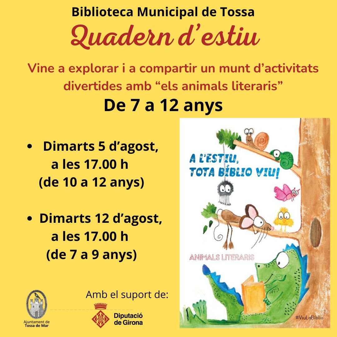 La Biblioteca de Tossa de Mar organitza aquest mes d’agost una nova activitat adreçada als infants del municipi: Quadern d’estiu – Vine a explorar amb els animals literaris!