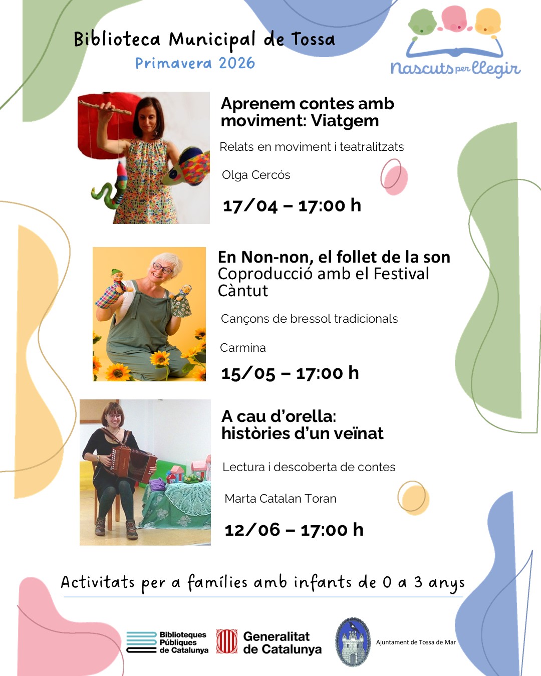 En el marc del programa, la Biblioteca Municipal de Tossa ofereix un programa de sessions adreçades a famílies amb nadons i infants petits, amb l’objectiu de descobrir el valor de la lectura en veu alta i de compartir experiències al voltant dels llibres.