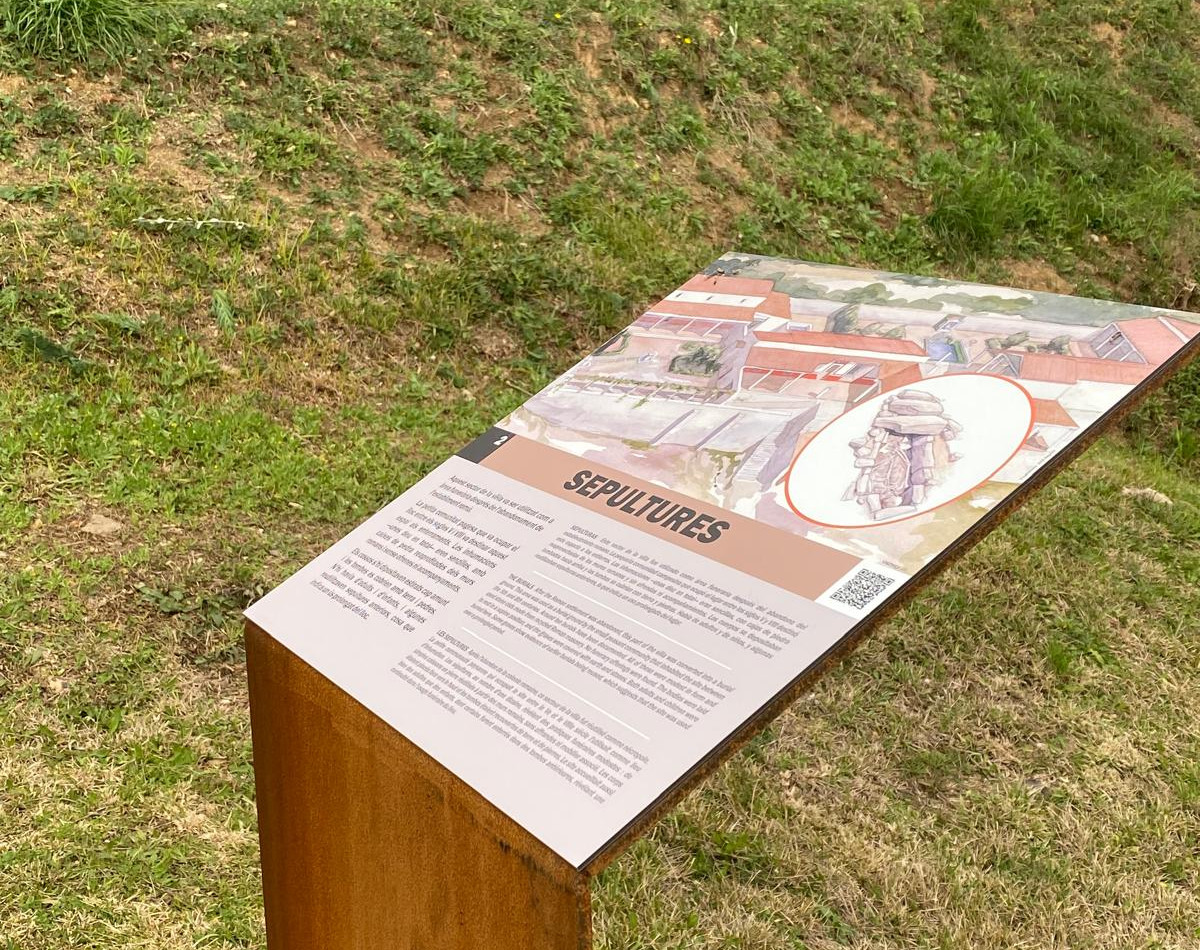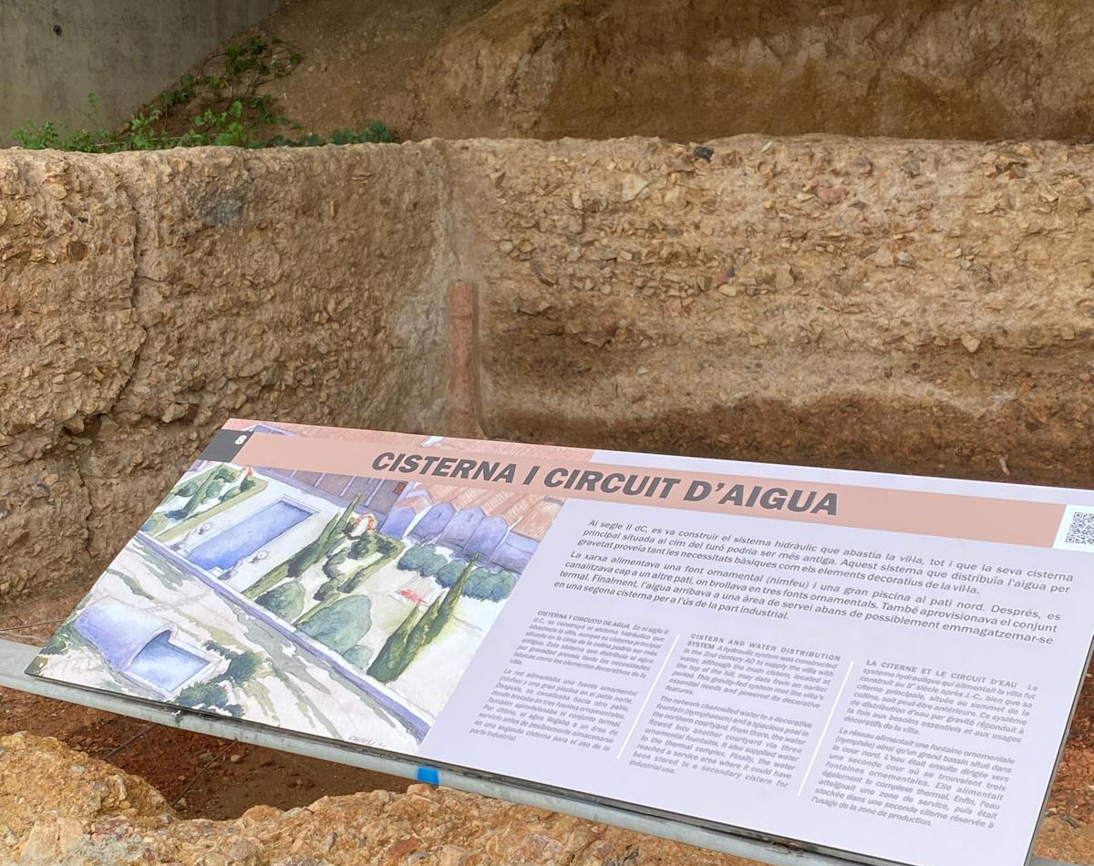 Els nous plafons informatius expliquen, entre d’altres, la cisterna situada a la terrassa de ponent, que abastia d’aigua tot el conjunt, així com la zona de la necròpolis localitzada a la part rústica, a tocar de l’avinguda Pelegrí, excavada l’any 2024 sota la direcció de l’arqueòleg Joan Linàs.