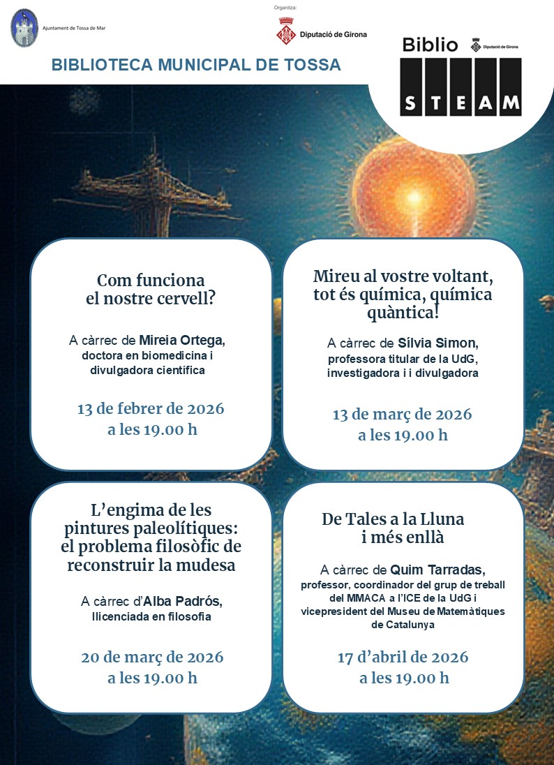 En el marc del programa, la Biblioteca Municipal de Tossa ha programat 4 sessions que es desenvoluparan entre febrer i abril de 2026, amb l’objectiu de convidar a la ciutadania a descobrir, reflexionar i interactuar amb la ciència i la tecnologia des de la biblioteca.