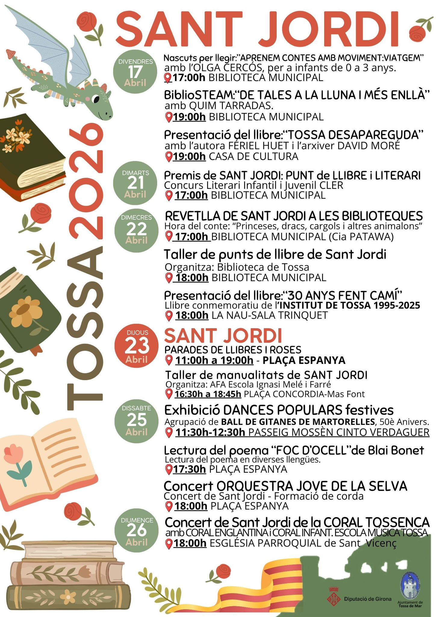Sant Jordi 2026 arriba carregat d’activitats a Tossa. Des del 17 d’abril fins al 26 d’abril s’han organitzat diferents propostes per a totes les edats.