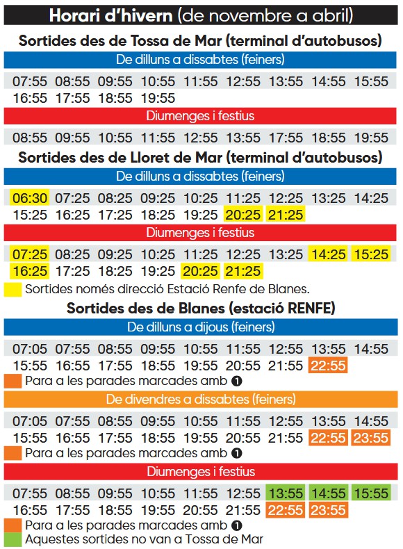 Horari d'hivern 2025: línia L69: Tossa (bus) - Lloret (bus) - Blanes (RENFE tren) [PDF]